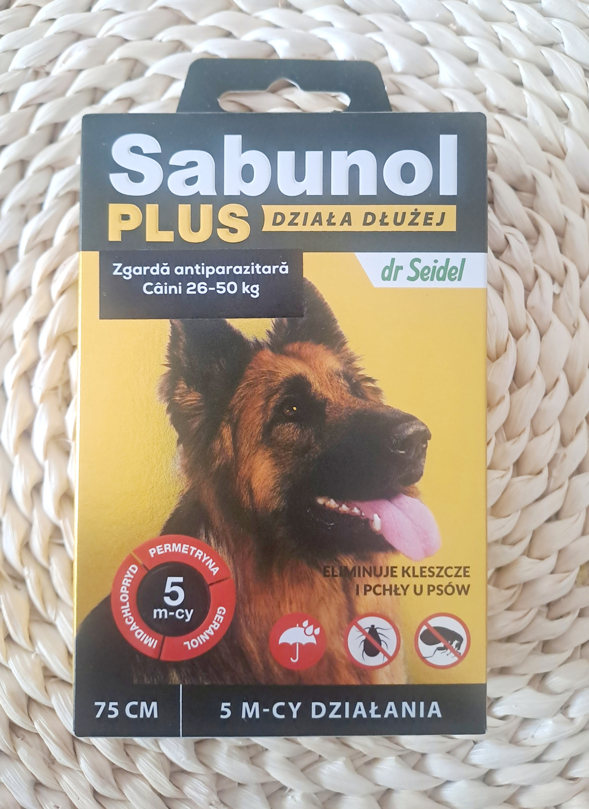 Sabunol PLUS este o zgarda moderna pentru caini, eficienta impotriva capuselor si puricilor. Noua tehnologie de productie si forma diferita a curelei zgarzii asigura o eliberare uniforma si de lunga durata a celor trei ingrediente active: permetrin, imidacloprid si geraniol. Zgarda este eficienta pentru o perioada de 5 luni. Efectele zgarzii sunt vizibile dupa doar 5 ore de la aplicare.