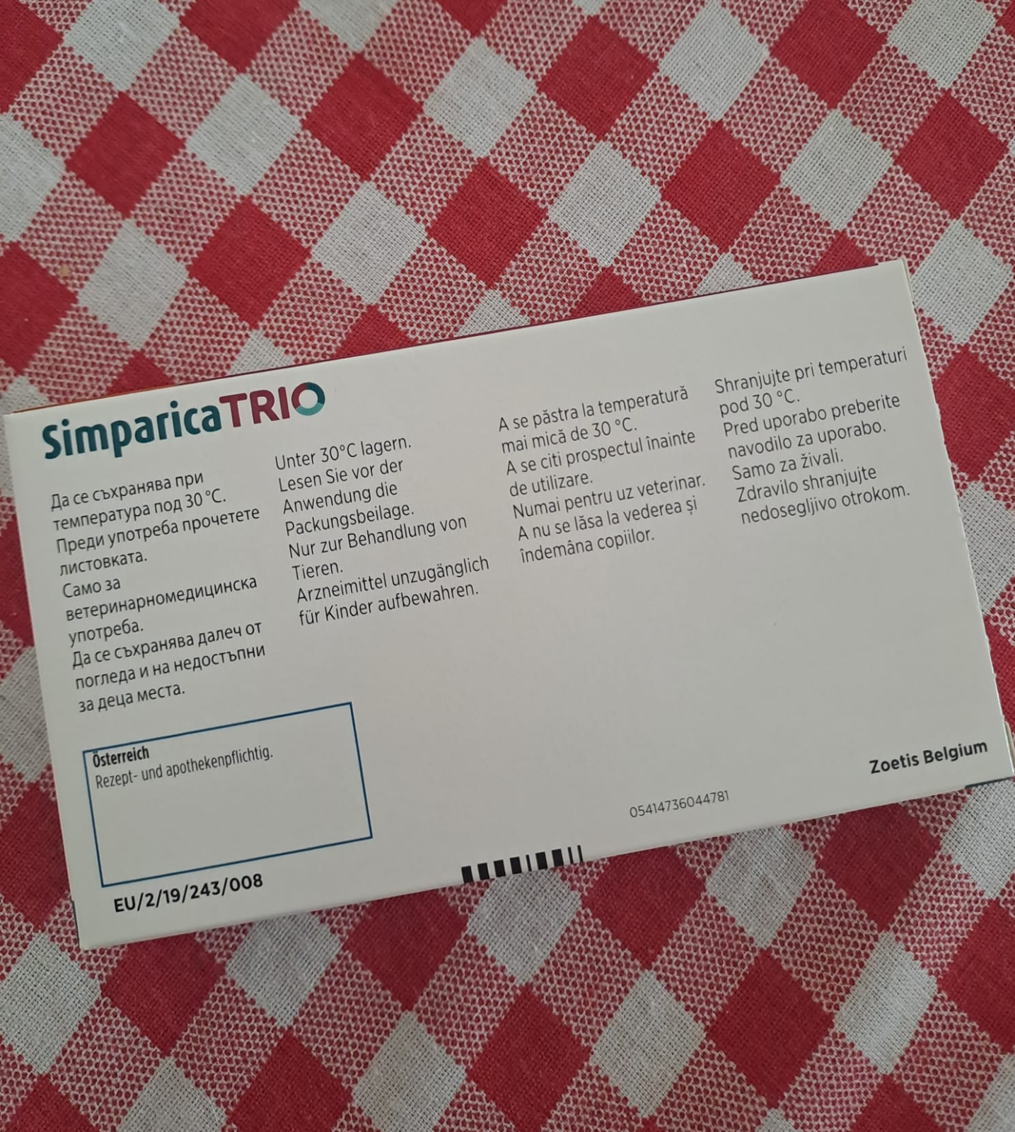 Simparica TRIO. Substanța activă: sarolaner, moxidectină, pirantel. Specia țintă: Câini. Indicații: Pentru câini cu infestare sau care prezintă risc de infestare cu paraziți externi și interni. Produsul medicinal veterinar este indicat exclusiv atunci când se utilizează în același timp împotriva căpușelor sau a puricilor și a nematodelor gastro-intestinale. Produsul medicinal veterinar are de asemenea eficacitate concomitentă pentru prevenirea dirofilariozei și angiostrongilozei.