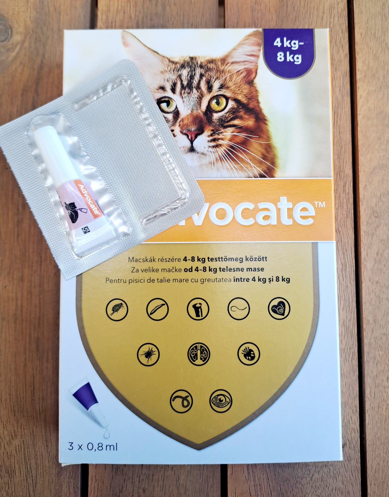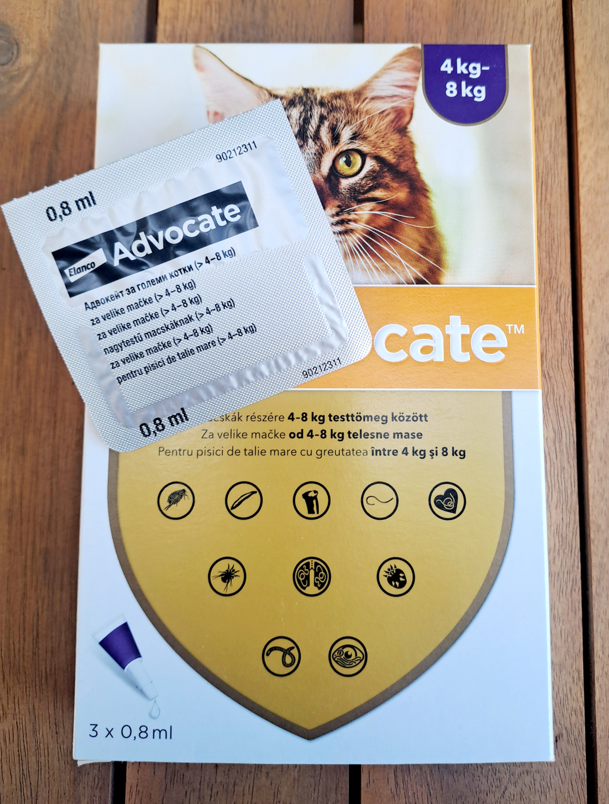 Advocate 80 Pisica (4 - 8 kg), 3 pipeteeste un produs antiparazitar de uz extern ce contine imidacloprid, si este foarte eficient in tratarea infestatiilor cu purici, pentru o perioada de o luna dupa o singura administrare. Pipeta Advocate poate fi folosita ca tratament pentru tratarea si prevenirea infestatiei cu purici (Ctenocephalides felis), tratarea raiei auriculare (Otodectes cynotis), prevenirea dirofilariozei cardiace (larve L3 si L4 de Dirofilaria immitis) si tratarea infestatiilor cu nematode gastrointestinale (larve L4, adulti imaturi si adulti de Toxocara cati si Ancylostoma tubaeforme). Produsul poate fi utilizat concomitent cu medicatia specifica in cazul dermatitei alergice provocata de purici (FAD). Compozitie: imidacloprid, moxidectin, alcool benzilic, hidroxibutiltoluen (E321: ca antioxidant) 1 mg/ml. Calea de administrare: aplicare externa pe piele.Metoda de administrare: scoateti pipeta cu doza unica din pachetul protector. Tineti pipeta cu doza unica in pozitie verticala, scoateti capacul, si cu ajutorul lui perforati pipeta. Se face o carare in parul animalului intre omoplati si se aplica continutul pipetei pe piele, fara a se masa. Puneti varful pipetei cu doza unica pe piele si presati pipeta de mai multe ori pentru a goli continutul direct pe piele in mai multe locuri pe spate.