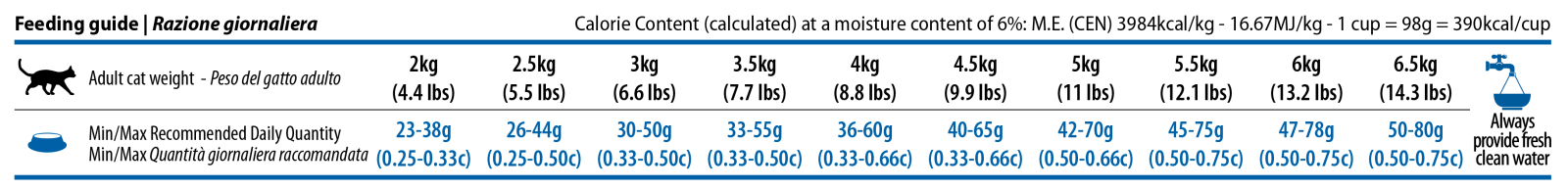 Aditivi per kgVitamina A 18000UI; vitamina D3 1200UI; vitamina E 600mg; vitamina C 300mg; Niacină 150mg; D-pantotenat de calciu 50mg; vitamina B2 20mg; vitamina B6 8.1mg; vitamina B1 10mg; Biotină 1.5mg; Acid folic 1.5mg; vitamina B12 0.1mg; Clorură de colină 2500mg; Beta-caroten 1.5mg; Zinc (chelat de zinc al analogului hidroxilat al metioninei): 163.80mg; Mangan (chelat de mangan al analogului hidroxilat al metioninei): 64.60mg; Fier [chelat de fier (II) al glicinei hidrat]: 58.30mg; Cupru (chelat de cupru al analogului hidroxilat al metioninei): 15.80mg; DL-metionină, tehnic pură 3500mg; Taurină 2000mg; Monoclorhidrat de L-lizină tehnic pură 1000mg. Aditivi senzoriali: extract de ceai verde 100mg; extract de rozmarin. Antioxidanți: extracte de tocoferol din uleiuri vegetale. Substanțe de acifiere a urinei: clorură de amoniu 3500mg; DL- metionină 3500mg.