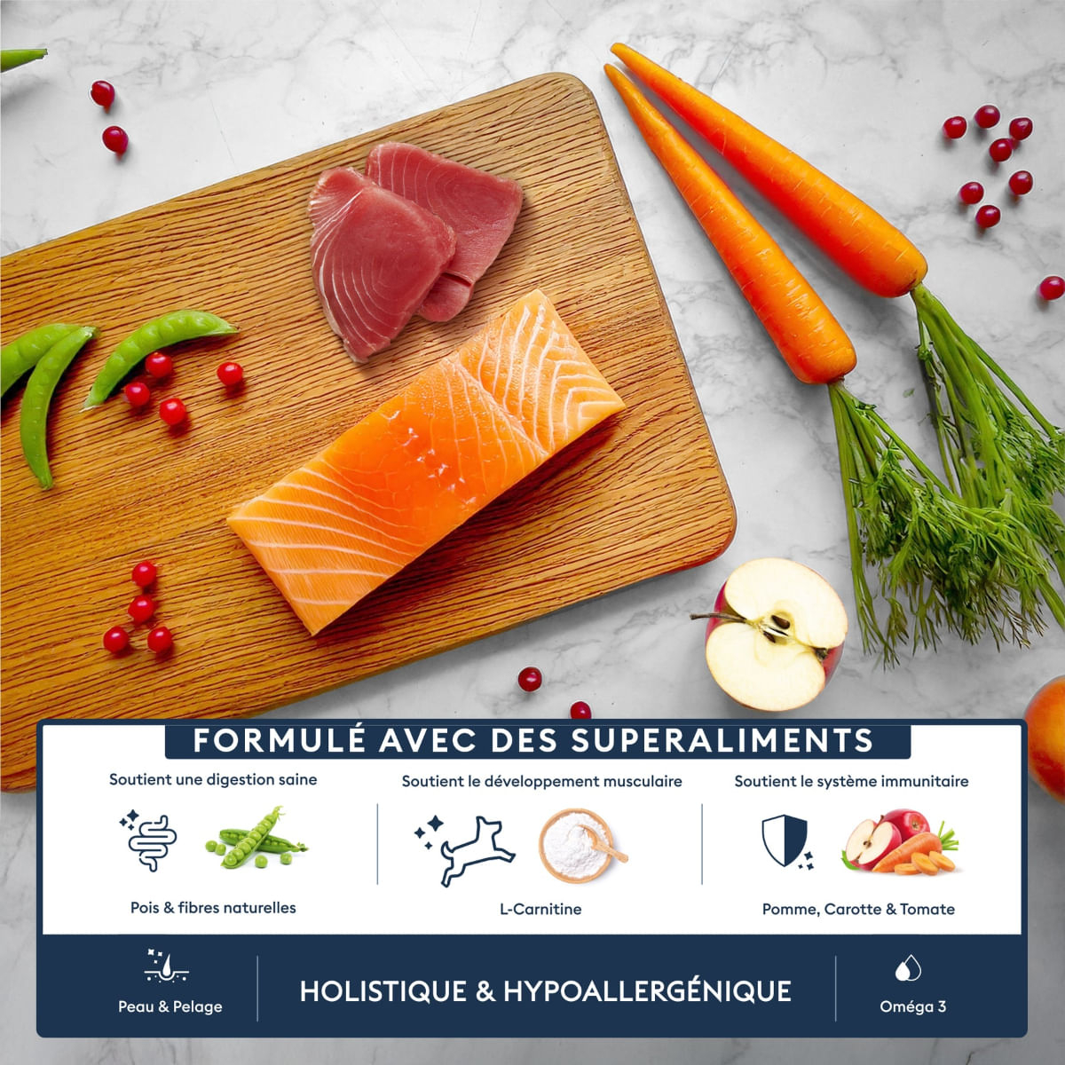 Pește alb (31%), pește albastru (30%) (somon proaspăt 26%, ton 2%, proteine de pește hidrolizate 2%), amidon de mazăre, grăsime animală (9%), tapioca, mazăre, pulpă de sfeclă, minerale, fibre vegetale, morcovi (0,5%), măr (0,5%), roșii (0,5%), cicoare (sursă de FOS), merișoare, pereți celulari de drojdie (sursă de MOS și beta-glucani) (0,075%), glucozamină (0,045%), sulfat de condroitină (0,035%), Yucca schidigera.
