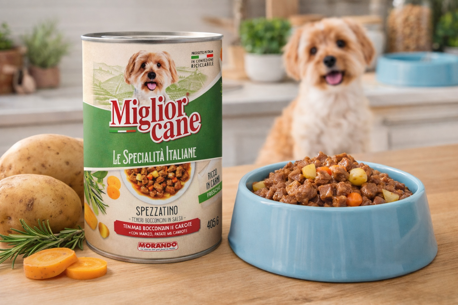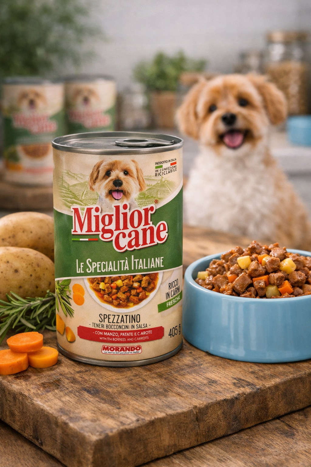 Bucăți mici fragede în sos care se inspiră dintr-o rețetă Spezzatino (tocană) cu carne proaspătă aburită până se înmoaie și îmbogățită cu legume italiene delicioase și ierburi aromatice precum rozmarin, salvie și oregano. Cantitatea potrivită de vitamine, zinc și cupru pentru a promova o blană și o piele sănătoase, menținând în același timp oasele câinelui tău. Cartofii și morcovii sunt potriviți și aprobați pentru consumul uman. Fără coloranți sau conservanți adăugați.